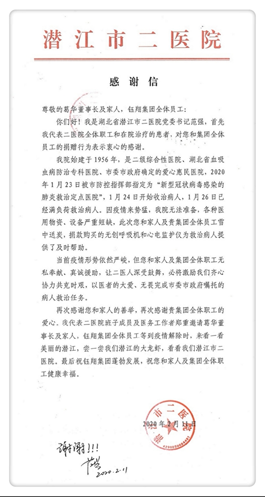 我院始建于1956年,是二級綜合性醫院,湖北省血吸蟲病防治專科醫院,市委、市政府確定的愛心惠民醫院。2020年1月23日被市防控指揮部指定為新型冠狀病毒感染的肺炎救治定點醫院,1月24日開始收治病人,1月26日已經滿負荷救治病人。因疫情來勢兇猛,我院無法準備,各種醫用物資、設備嚴重短缺,此次您和家人及貴集團全體員工雪中送炭捐款購買的無創呼吸機和心電監護儀,為救治病人提供了及時幫助。當前疫情形勢依然嚴峻,但您和家人、集團員工無私奉獻、真誠援助,讓二醫人深受鼓舞,必將激勵著我們齊心協力共克時艱,以醫者大愛、無畏,完成市委、市政府布置的病人救治任務。再次感謝您及家人的善舉,再次感謝貴集團全體職工的愛心。我代表二醫院班子成員及醫務工作者鄭重邀請葛華董事長與家人、鈺翔集團全體員工等到疫情結束時來看一看美麗的潛江,嘗一嘗我們潛江的小龍蝦,看一看我們潛江市二醫院。