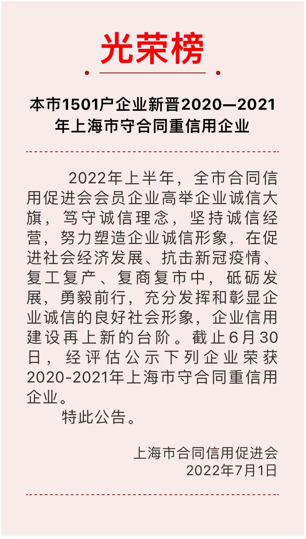 7月1日,上海市合同信用促進會公示了“上海市1501戶企業新晉2020-2021年上海市守合同重信用企業”光榮榜。