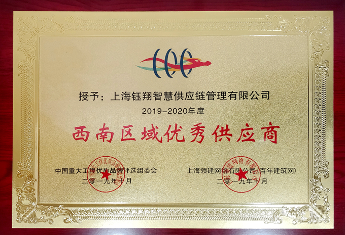 近日,上海鈺翔智慧供應(yīng)鏈管理有限公司被百年建筑網(wǎng)評為“西南區(qū)域優(yōu)秀供應(yīng)商”稱號。